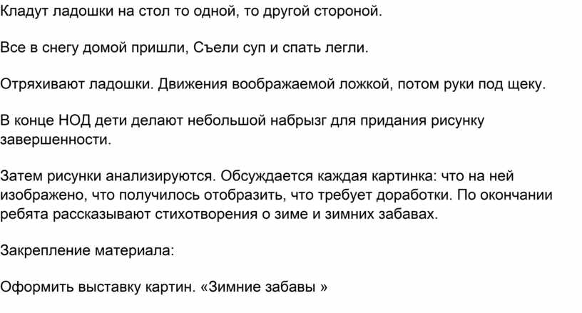Затем рисунки анализируются. Обсуждается каждая картинка: что на ней изображено, что получилось отобразить, что требует доработки. По окончании ребята рассказывают стихотворения о зиме и зимних забавах.