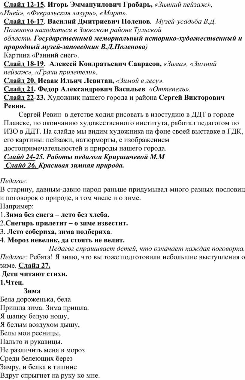 Педагог: Ребята! Я знаю, что вы тоже подготовили небольшие выступления о зиме. Слайд 27.