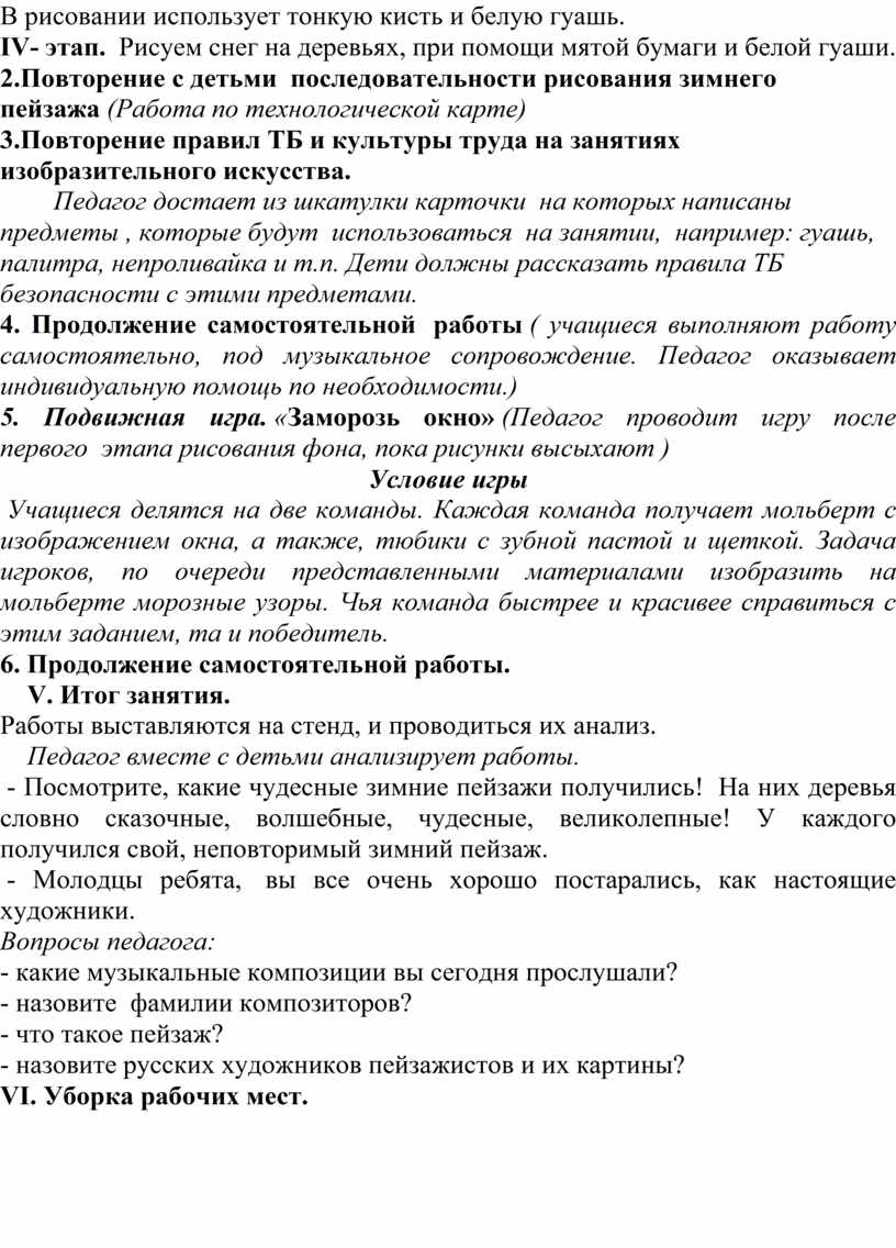 2.Повторение с детьми последовательности рисования зимнего пейзажа (Работа по технологической карте)