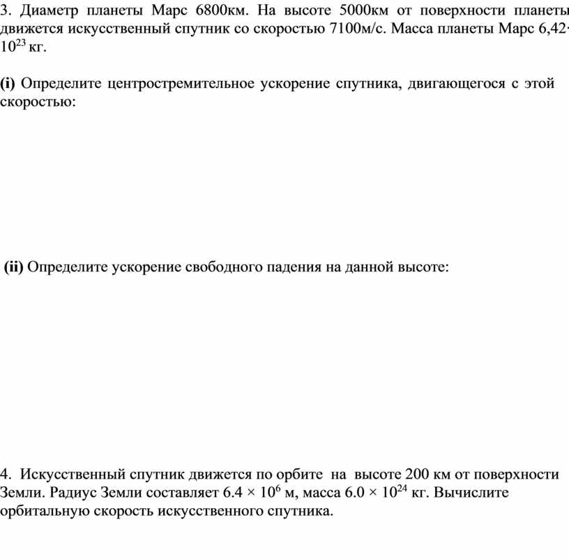 3. Диаметр планеты Марс 6800км. На высоте 5000км от поверхности планеты движется искусственный спутник со скоростью 7100м/с. Масса планеты Марс 6,42∙ 1023 кг.
