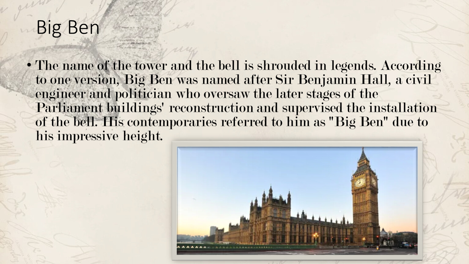 The name of the tower and the bell is shrouded in legends. According to one version, Big Ben was named after Sir Benjamin Hall, a civil engineer and politician who oversaw the later stages of the Parliament buildings' reconstruction and supervised the installation of the bell. His contemporaries referred to him as "Big Ben" due to his impressive height.