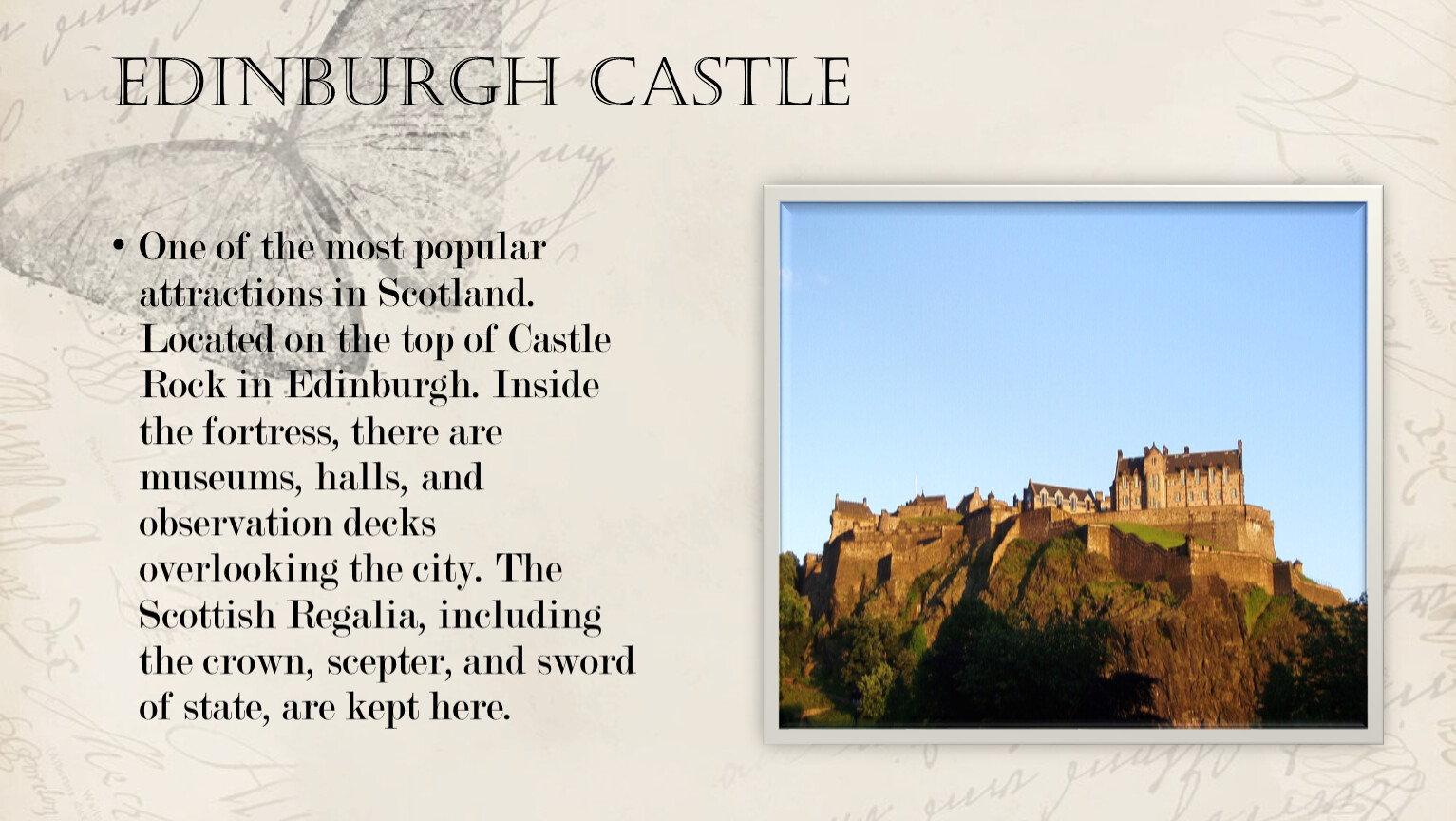 One of the most popular attractions in Scotland. Located on the top of Castle Rock in Edinburgh. Inside the fortress, there are museums, halls, and observation decks overlooking the city. The Scottish Regalia, including the crown, scepter, and sword of state, are kept here.
