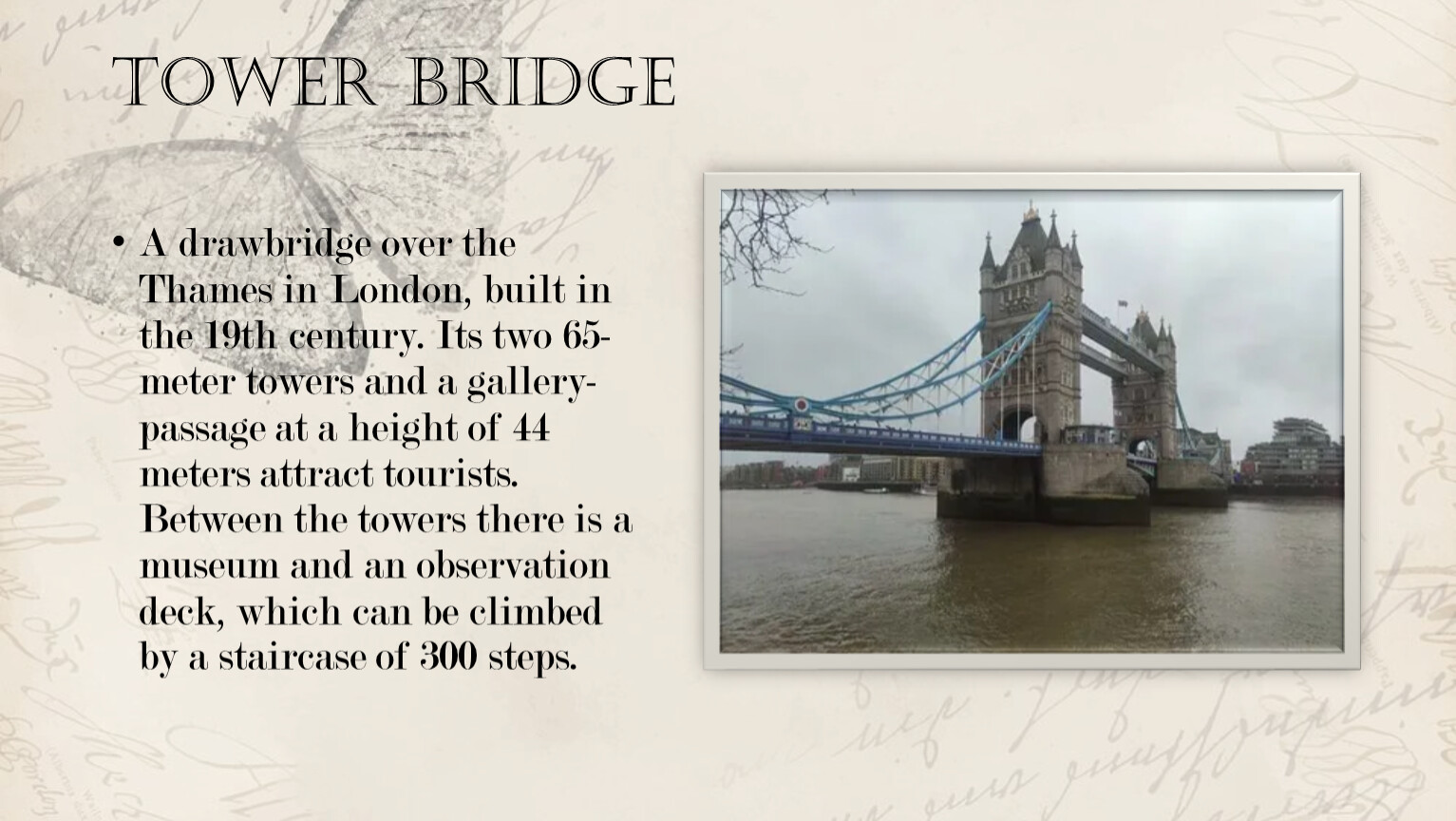A drawbridge over the Thames in London, built in the 19th century. Its two 65-meter towers and a gallery-passage at a height of 44 meters attract tourists. Between the towers there is a museum and an observation deck, which can be climbed by a staircase of 300 steps.