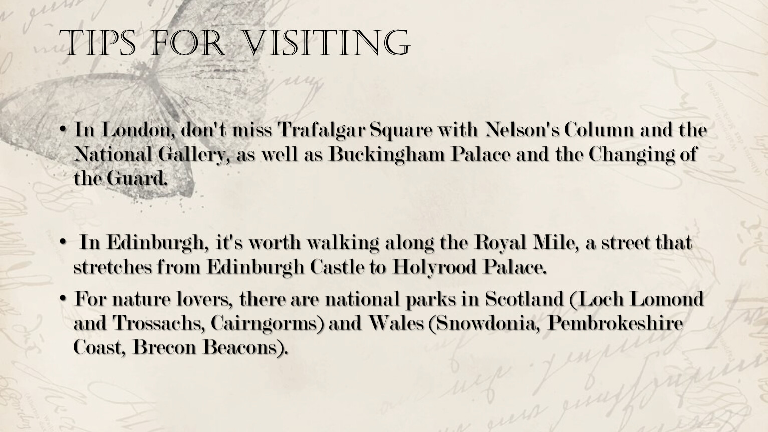 For nature lovers, there are national parks in Scotland (Loch Lomond and Trossachs, Cairngorms) and Wales (Snowdonia, Pembrokeshire Coast, Brecon Beacons).