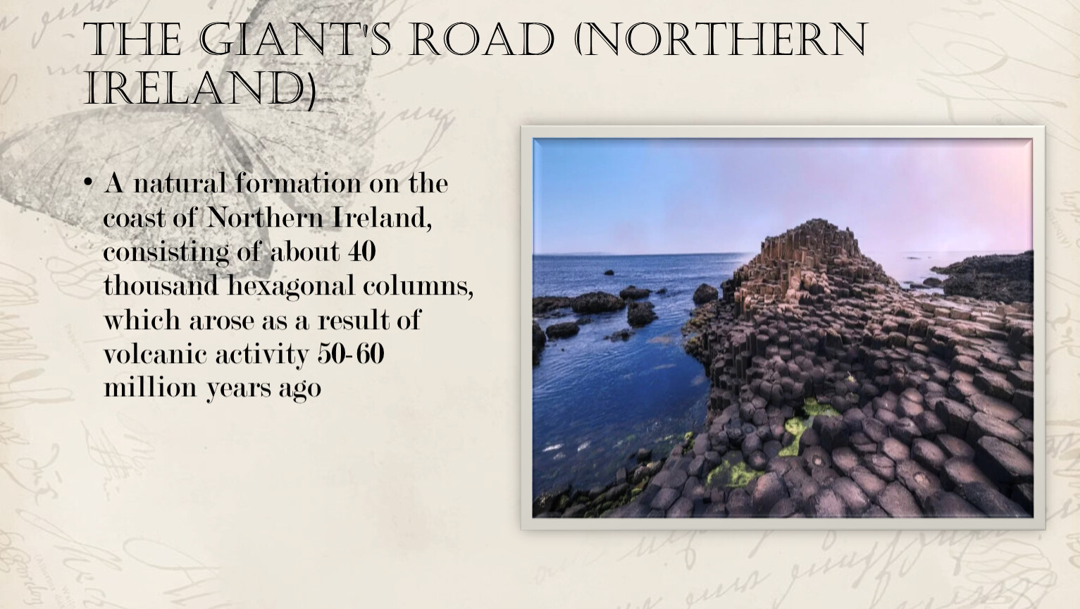 A natural formation on the coast of Northern Ireland, consisting of about 40 thousand hexagonal columns, which arose as a result of volcanic activity 50-60 million years ago