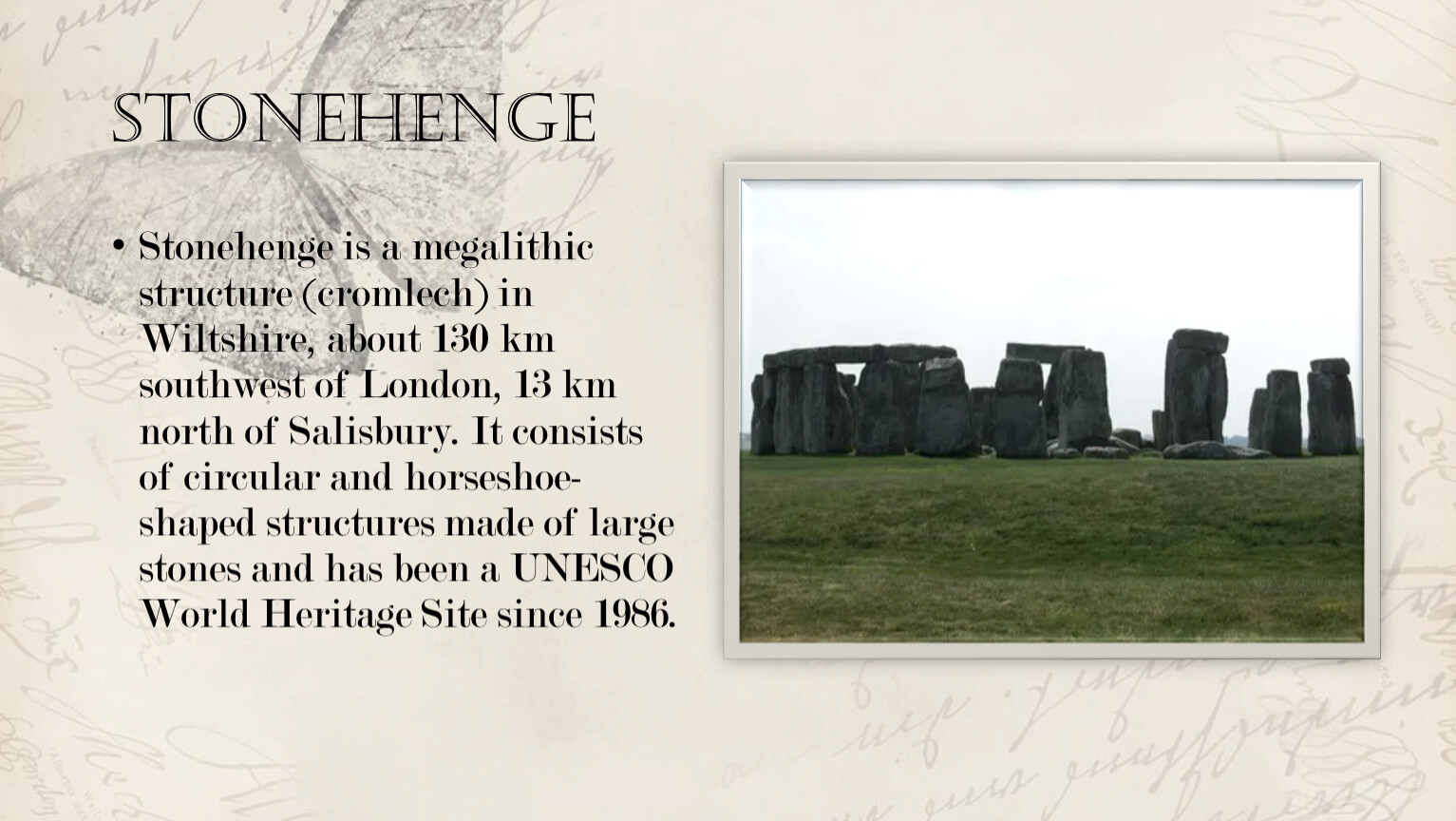 Stonehenge is a megalithic structure (cromlech) in Wiltshire, about 130 km southwest of London, 13 km north of Salisbury. It consists of circular and horseshoe-shaped structures made of large stones and has been a UNESCO World Heritage Site since 1986.