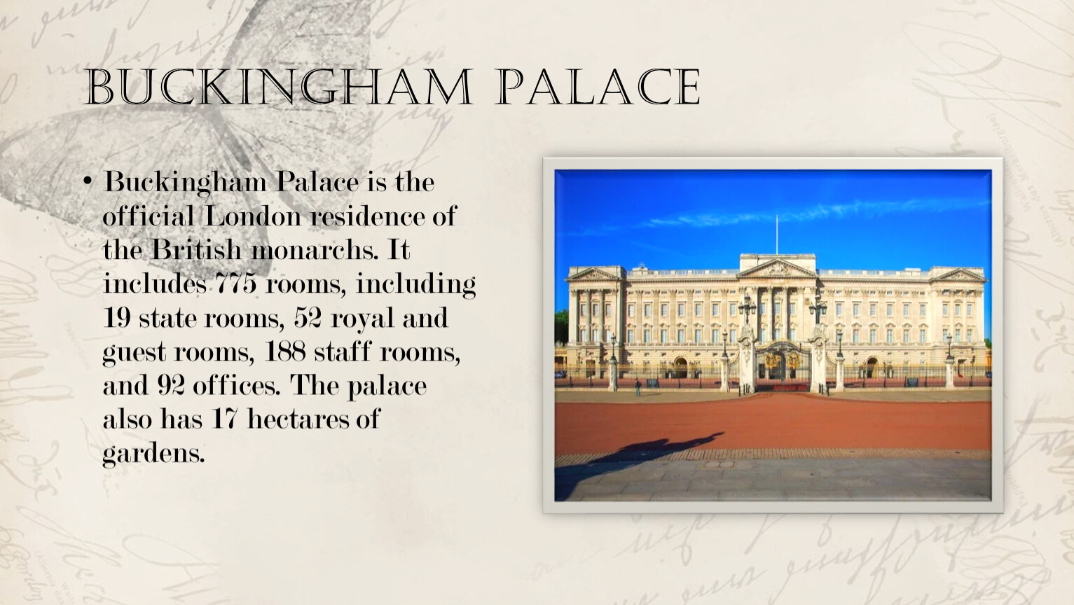 Buckingham Palace is the official London residence of the British monarchs. It includes 775 rooms, including 19 state rooms, 52 royal and guest rooms, 188 staff rooms, and 92 offices. The palace also has 17 hectares of gardens.