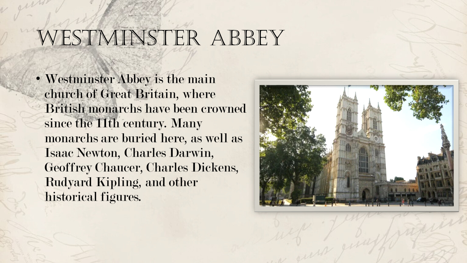 Westminster Abbey is the main church of Great Britain, where British monarchs have been crowned since the 11th century. Many monarchs are buried here, as well as Isaac Newton, Charles Darwin, Geoffrey Chaucer, Charles Dickens, Rudyard Kipling, and other historical figures.