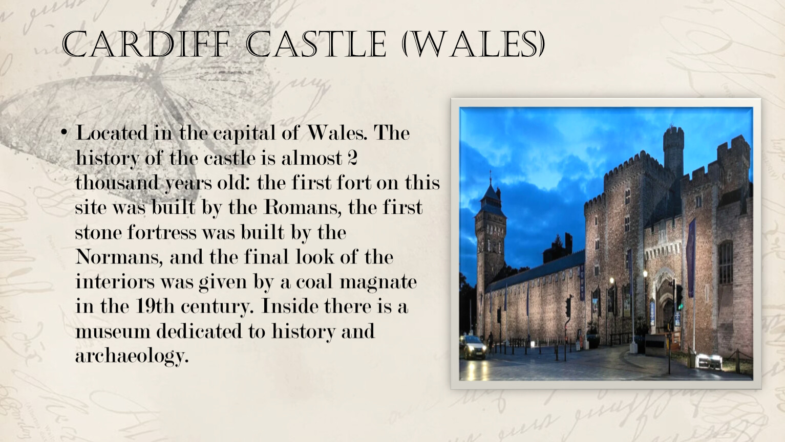 Located in the capital of Wales. The history of the castle is almost 2 thousand years old: the first fort on this site was built by the Romans, the first stone fortress was built by the Normans, and the final look of the interiors was given by a coal magnate in the 19th century. Inside there is a museum dedicated to history and archaeology.