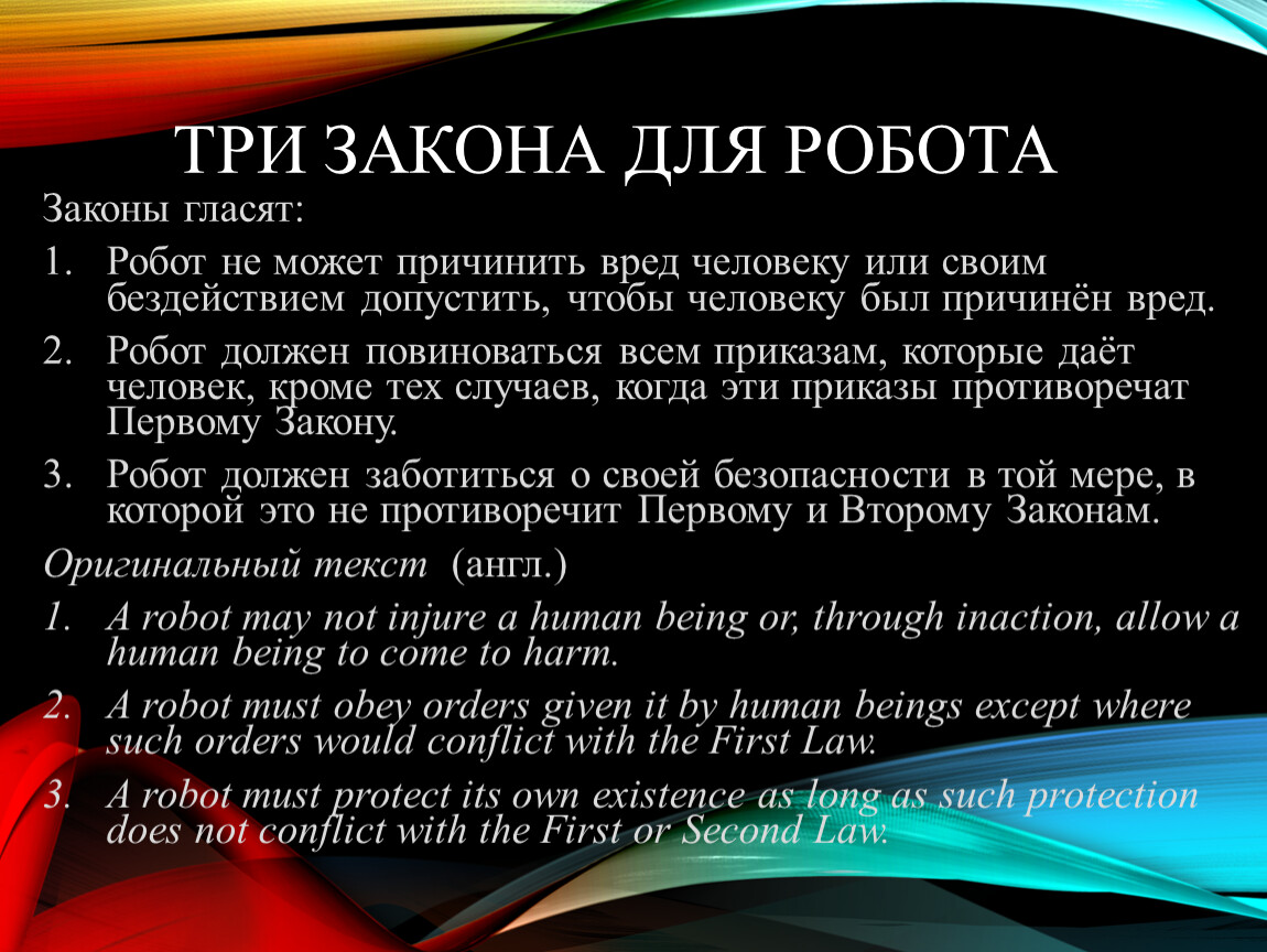 Робот не может причинить вред человеку или своим бездействием допустить, чтобы человеку был причинён вред.