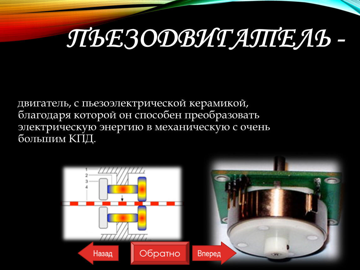 двигатель, с пьезоэлектрической керамикой, благодаря которой он способен преобразовать электрическую энергию в механическую с очень большим КПД.