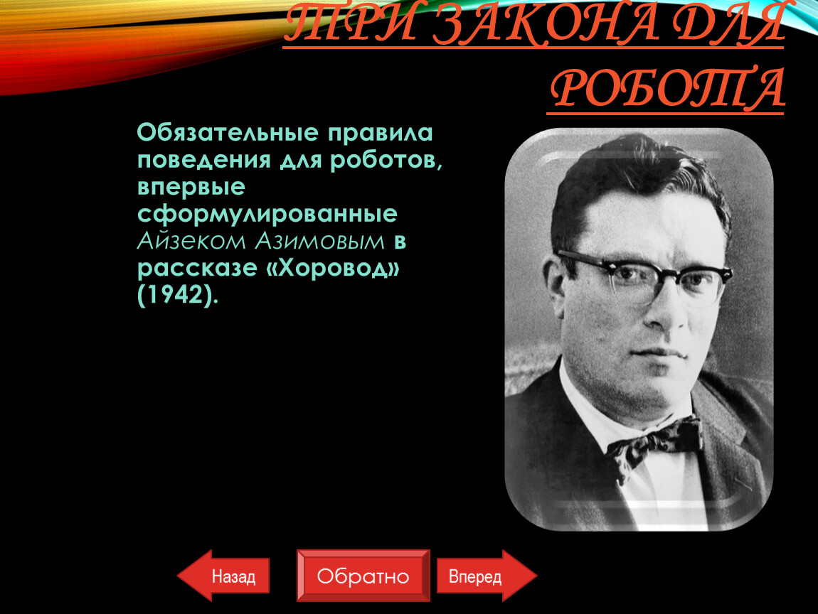 Обязательные правила поведения для роботов, впервые сформулированные Айзеком Азимовым в рассказе «Хоровод» (1942).