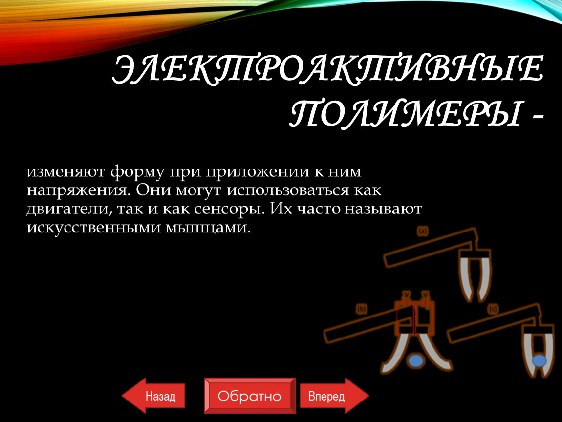 изменяют форму при приложении к ним напряжения. Они могут использоваться как двигатели, так и как сенсоры. Их часто называют искусственными мышцами.