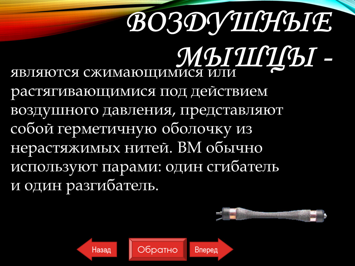 являются сжимающимися или растягивающимися под действием воздушного давления, представляют собой герметичную оболочку из нерастяжимых нитей. ВМ обычно используют парами: один сгибатель и один разгибатель.