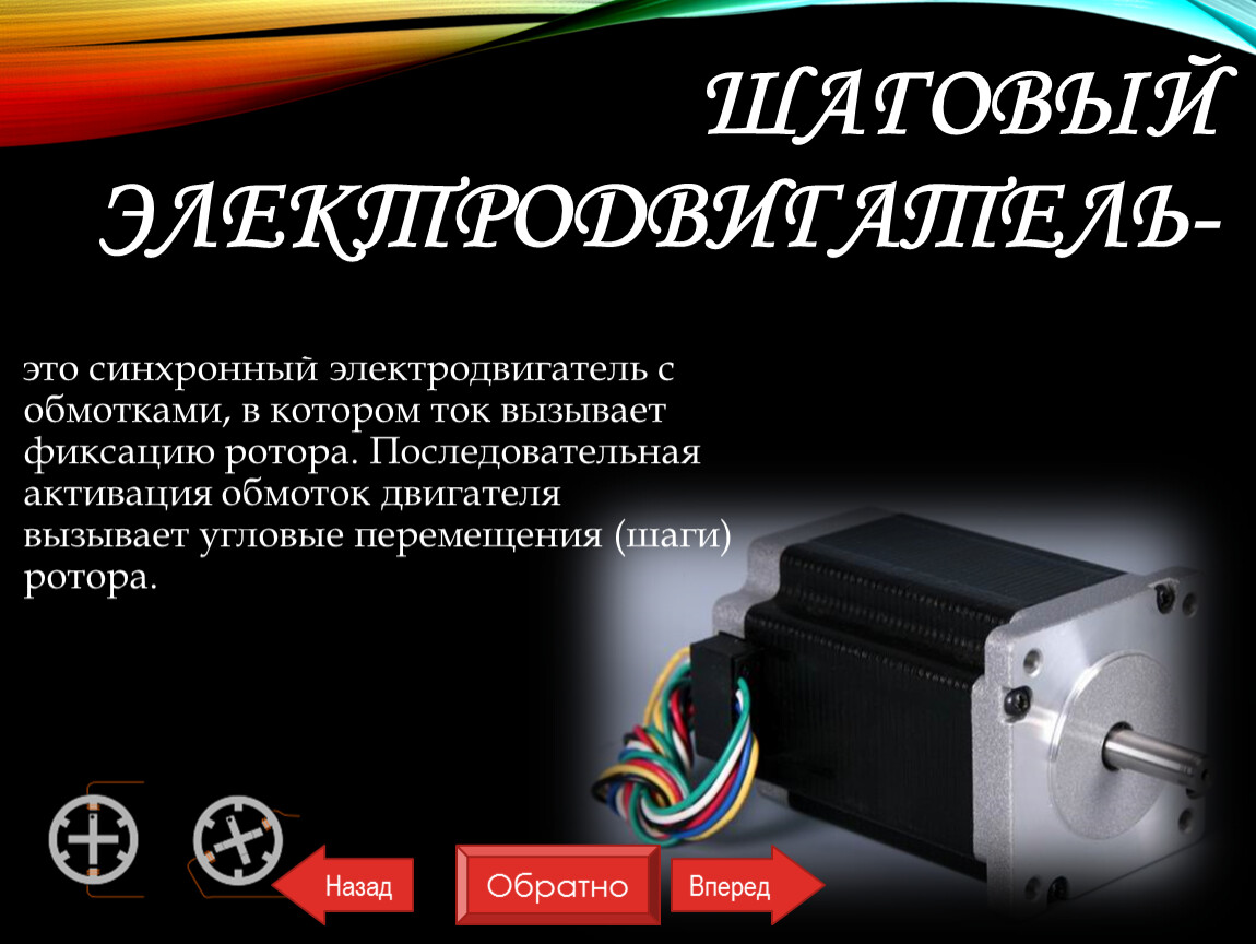 это синхронный электродвигатель с обмотками, в котором ток вызывает фиксацию ротора. Последовательная активация обмоток двигателя вызывает угловые перемещения (шаги) ротора.