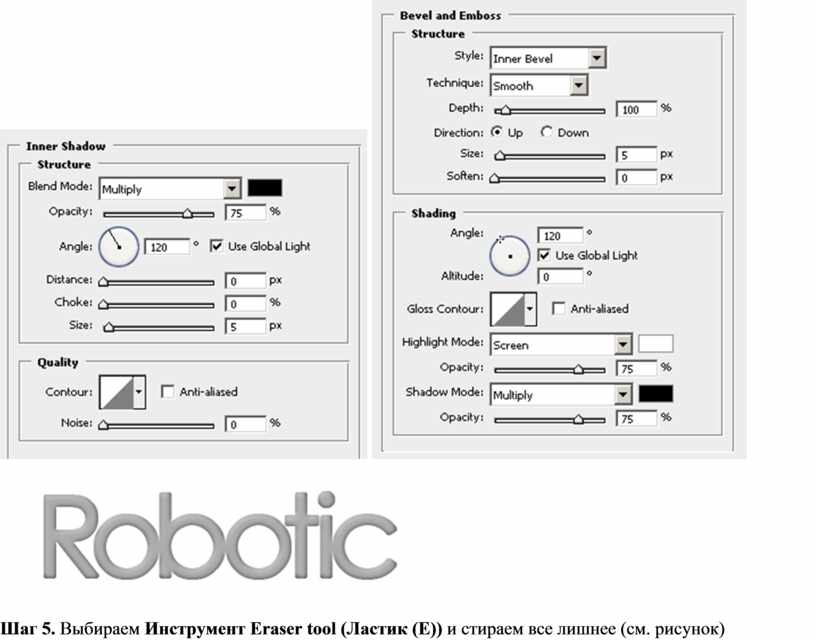 Шаг 4. Теперь, идем в Стили Слоя (Layer Styles) этого слоя (нажав на соответствующую (вторую слева) кнопочку внизу Палитры Слоев) и задаем там для Inner Shadow (Внутренняя Тень) и Bevel and Emboss (Тиснение) следующие параметры: