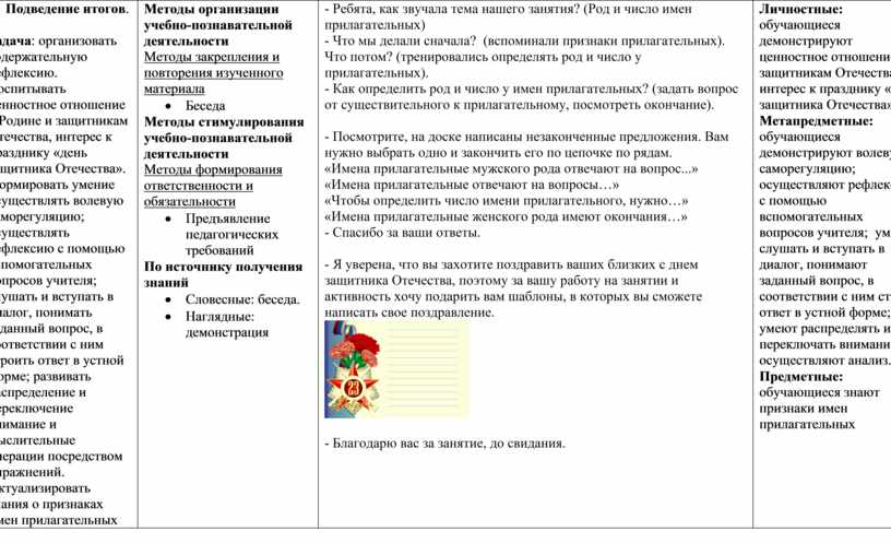 Личностные: обучающиеся демонстрируют ценностное отношение к Родине и защитникам Отечества. Метапредметные: обучающиеся понимают и принимают учебную задачу; демонстрируют волевую саморегуляцию; умеют работать в парах; умеют слушать и вступать в диалог, понимают заданный вопрос; умеют распределять и переключать внимание, осуществляют анализ и синтез. Предметные: обучающиеся знают признаки имен прилагательных, умеют определять род и число имен прилагательных. |