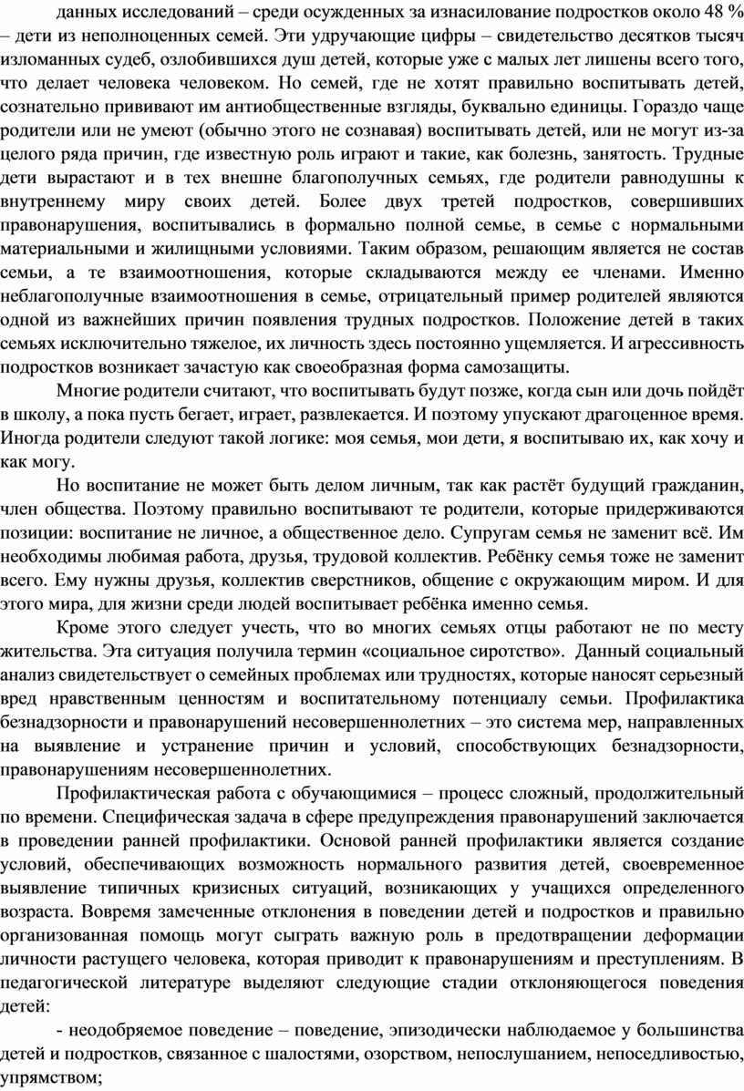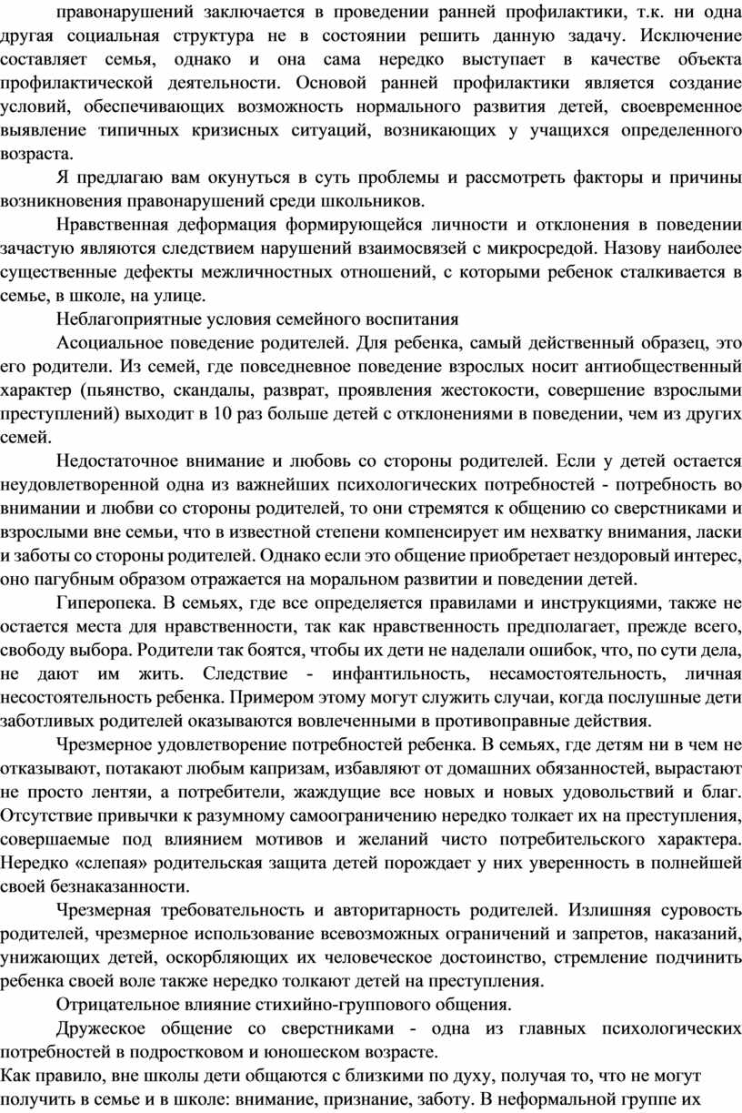 Проблема профилактики противоправного поведения несовершеннолетних - одна из центральных для целого ряда отраслей науки. Криминологи, педагоги, психологи пытаются найти средства для того, чтобы поведение детей, подростков, юношей и девушек не приобрело противоправную направленность.
