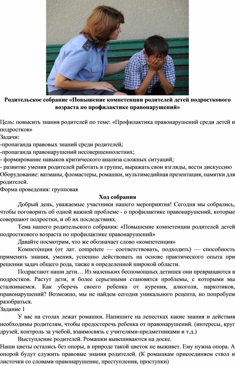 Родительское собрание «Повышение компетенции родителей детей подросткового возраста по профилактике правонарушений» |