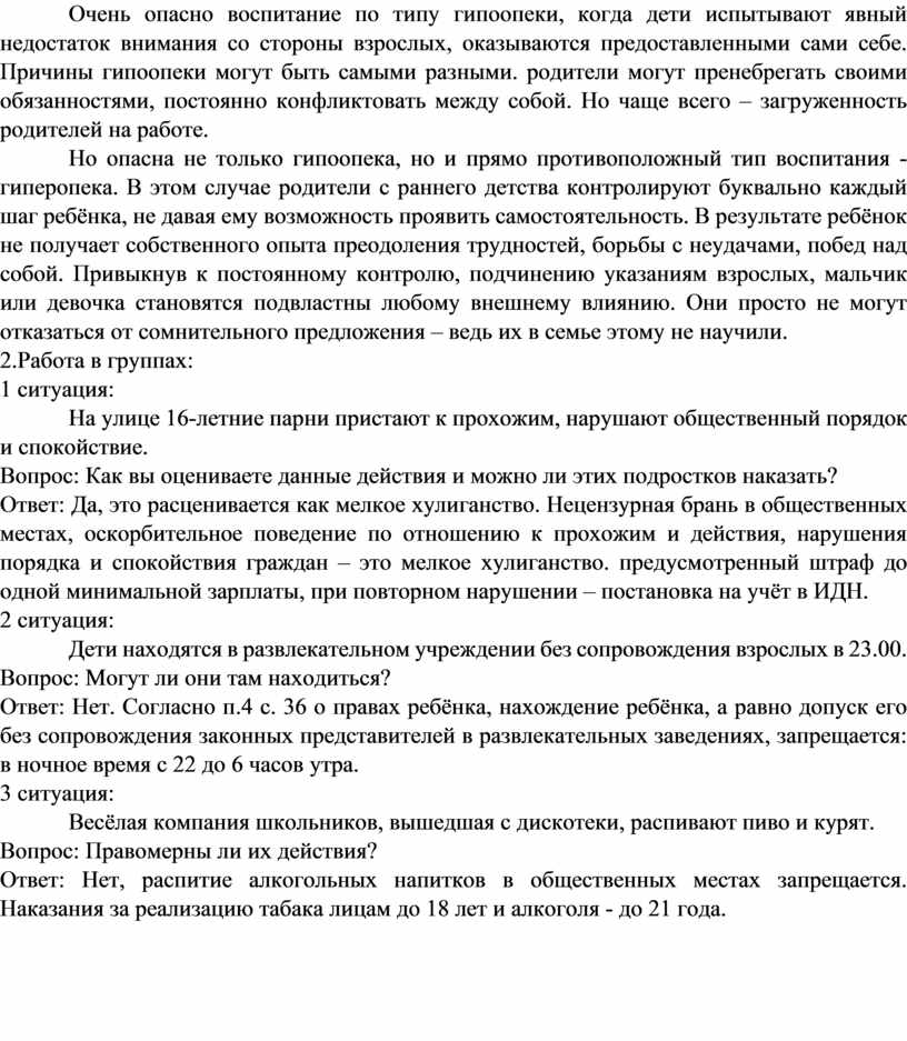 Гиперопека. В семьях, где все определяется правилами и инструкциями, также не остается места для нравственности, так как нравственность предполагает, прежде всего, свободу выбора. Родители так боятся, чтобы их дети не наделали ошибок, что, по сути дела, не дают им жить. Следствие - инфантильность, несамостоятельность, личная несостоятельность ребенка. Примером этому могут служить случаи, когда послушные дети заботливых родителей оказываются вовлеченными в противоправные действия.