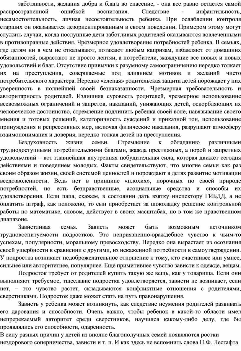 Чрезмерное удовлетворение потребностей ребенка. В семьях, где детям ни в чем не отказывают, потакают любым капризам, избавляют от домашних обязанностей, вырастают не просто лентяи, а потребители, жаждущие все новых и новых удовольствий и благ. Отсутствие привычки к разумному самоограничению нередко толкает их на преступления, совершаемые под влиянием мотивов и желаний чисто потребительского характера. Нередко «слепая» родительская защита детей порождает у них уверенность в полнейшей своей безнаказанности.