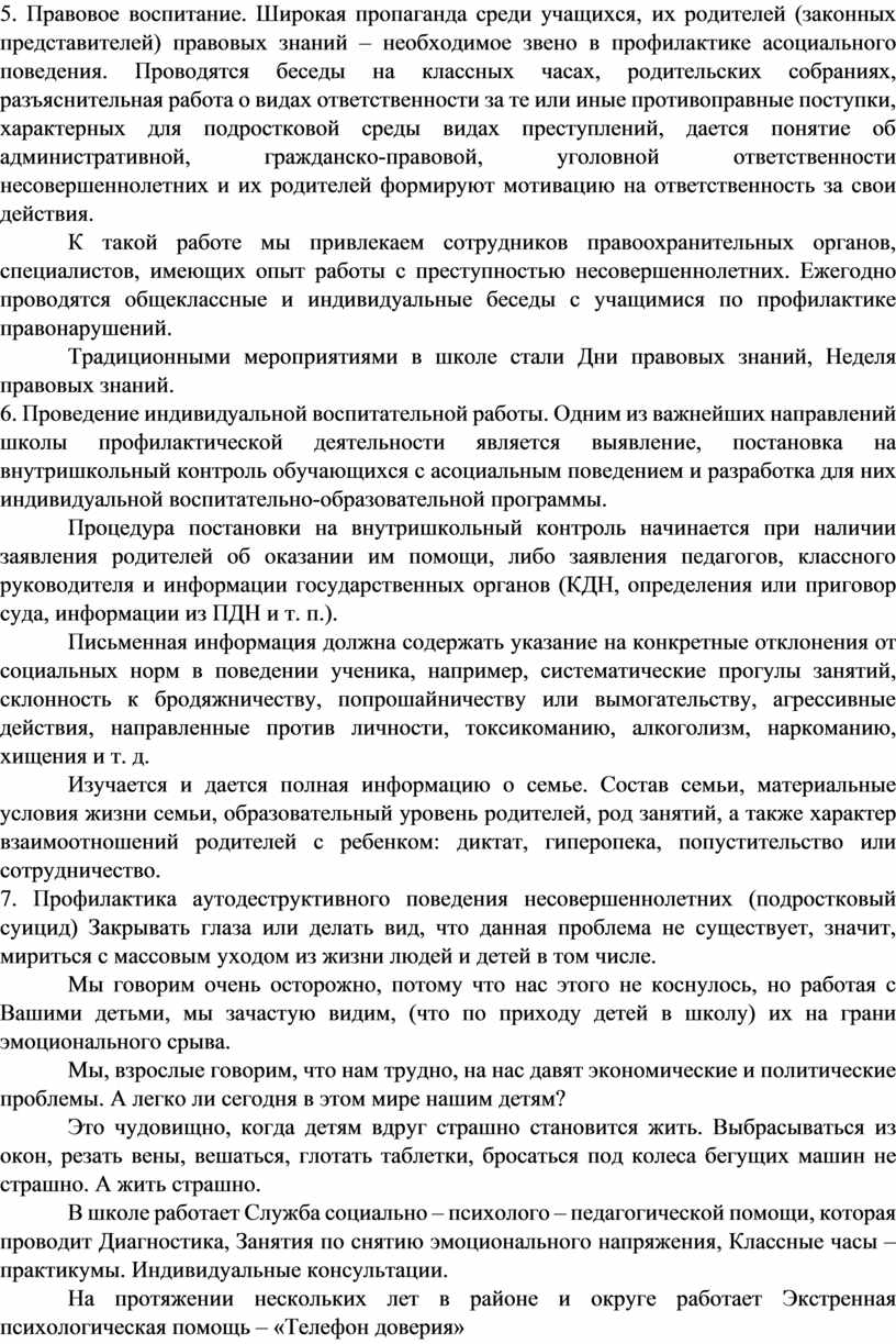 В школе ведётся наблюдение за детьми, склонными к правонарушениям, обсуждаются проступки учащихся на педсоветах, административных совещаниях, Совете профилактики.