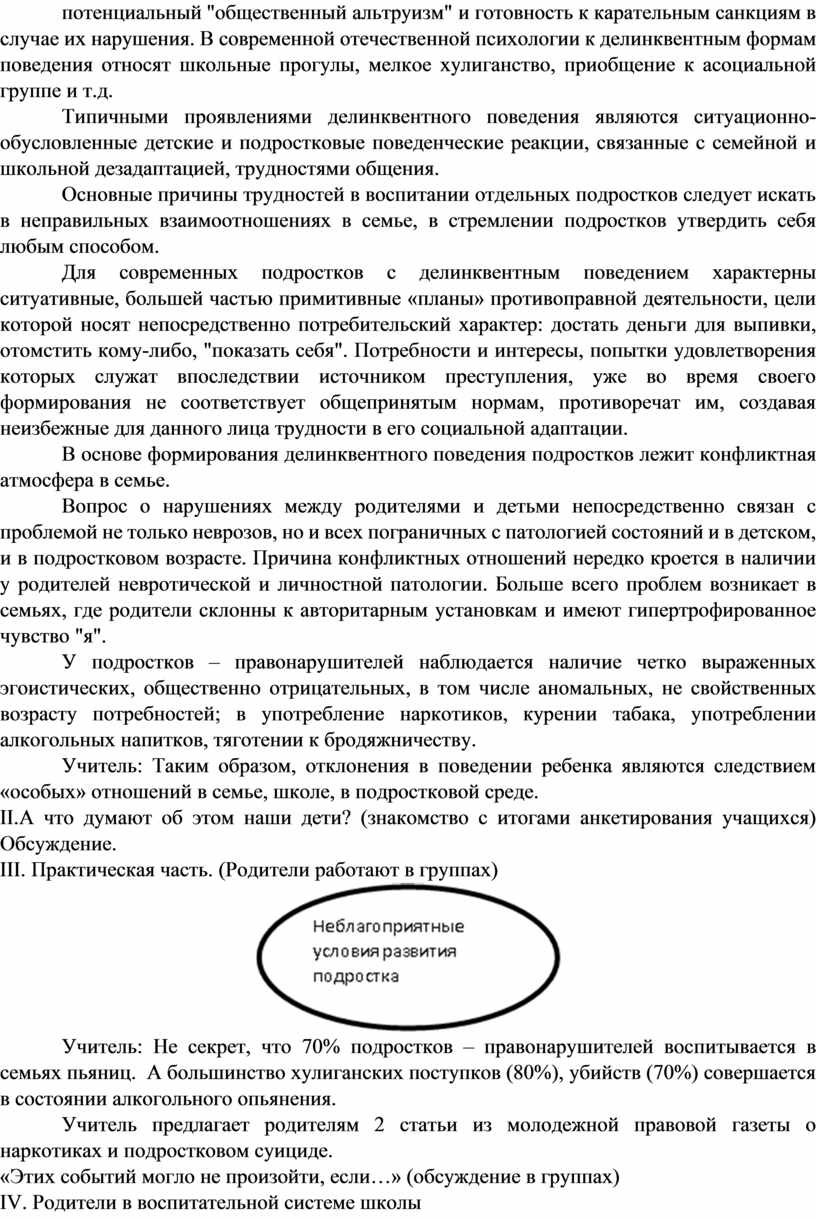 Учитель: Таким образом, отклонения в поведении ребенка являются следствием «особых» отношений в семье, школе, в подростковой среде.
