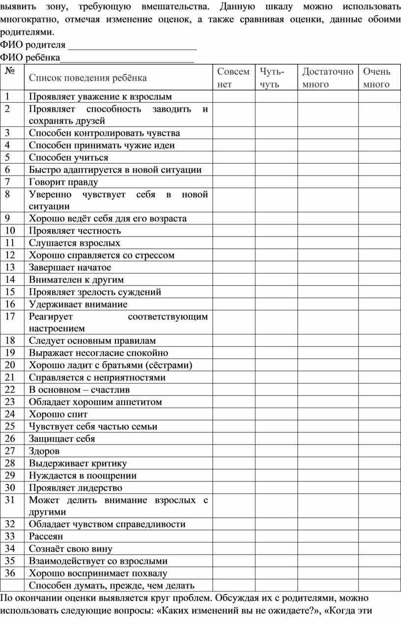 По окончании оценки выявляется круг проблем. Обсуждая их с родителями, можно использовать следующие вопросы: «Каких изменений вы не ожидаете?», «Когда эти изменения должны произойти?», «Что будет способствовать изменениям?», «Какие препятствия могут им помешать».