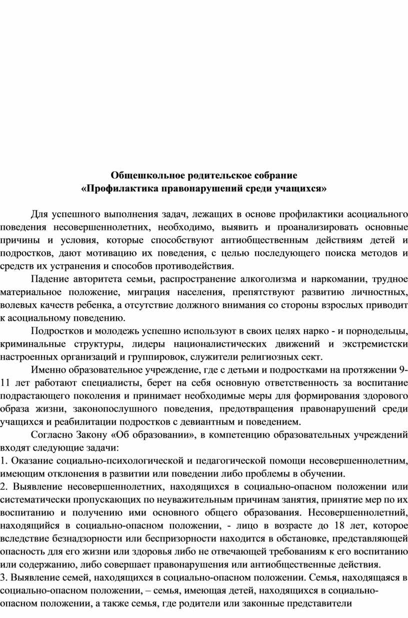 Общешкольное родительское собрание «Профилактика правонарушений среди учащихся» |