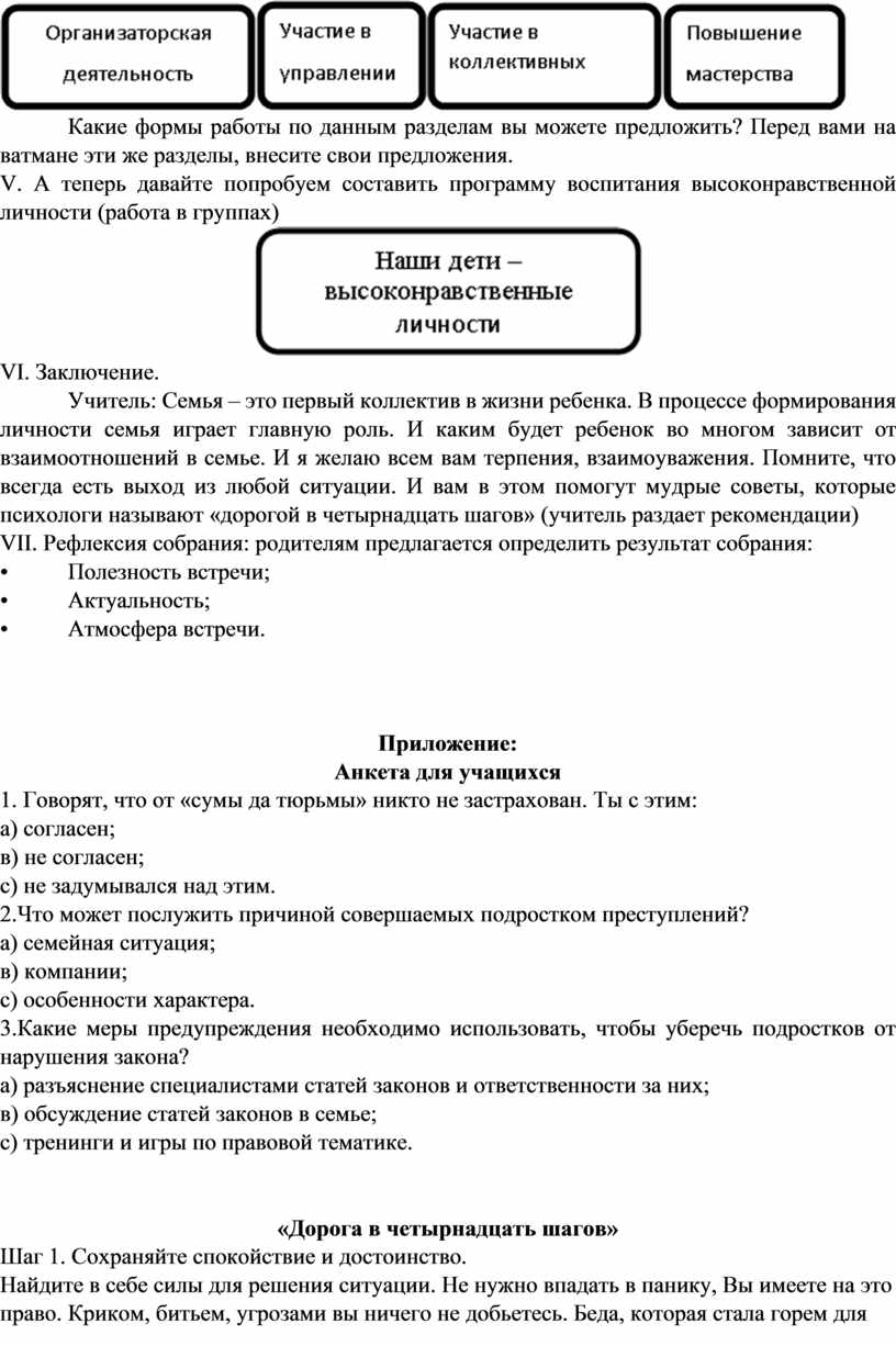 Учитель: Семья – это первый коллектив в жизни ребенка. В процессе формирования личности семья играет главную роль. И каким будет ребенок во многом зависит от взаимоотношений в семье. И я желаю всем вам терпения, взаимоуважения. Помните, что всегда есть выход из любой ситуации. И вам в этом помогут мудрые советы, которые психологи называют «дорогой в четырнадцать шагов» (учитель раздает рекомендации)