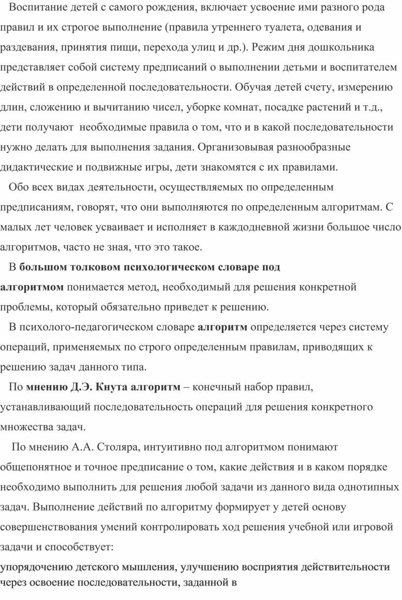 По мнению А.А. Столяра, интуитивно под алгоритмом понимают общепонятное и точное предписание о том, какие действия и в каком порядке необходимо выполнить для решения любой задачи из данного вида однотипных задач. Выполнение действий по алгоритму формирует у детей основу совершенствования умений контролировать ход решения учебной или игровой задачи и способствует: