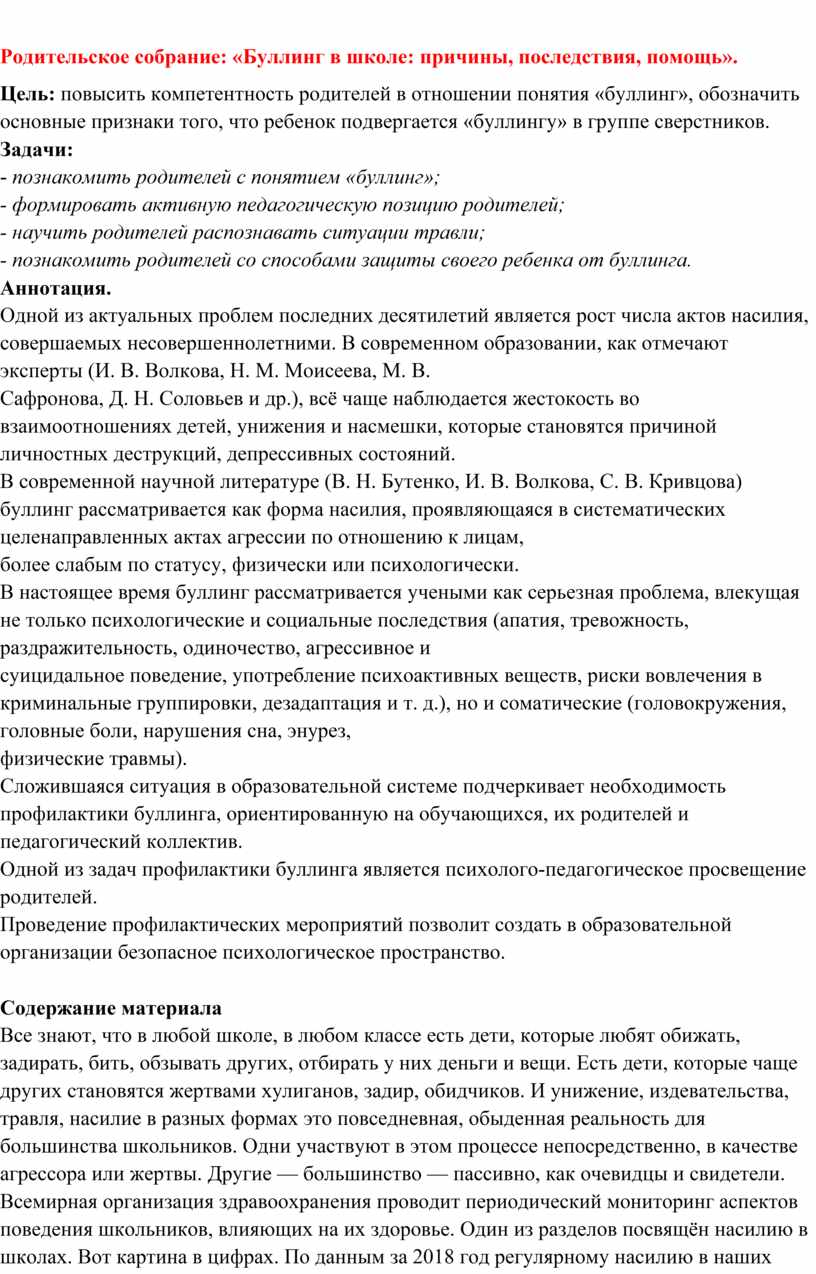 Родительское собрание: «Буллинг в школе: причины, последствия, помощь».