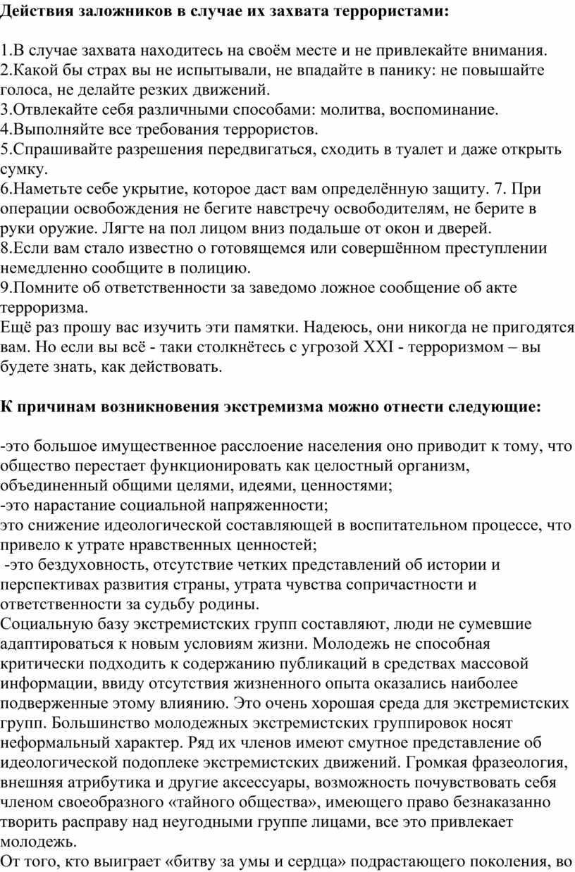 Цель: проинформировать родителей о правилах поведения в случаях теракта.