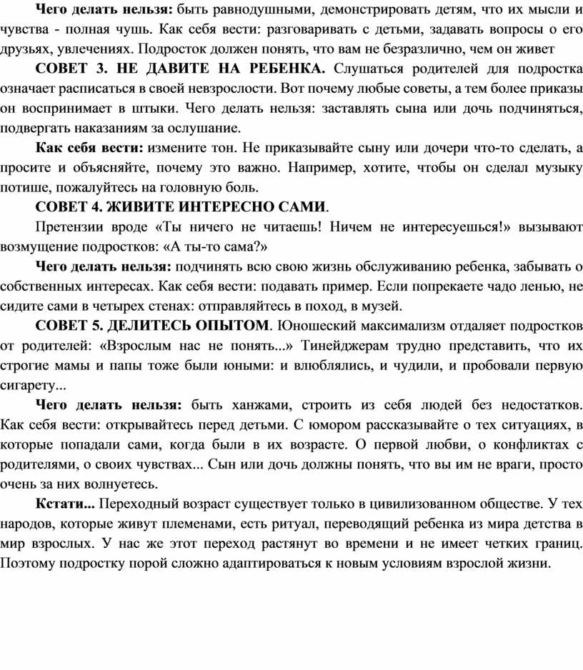 СОВЕТ 3. НЕ ДАВИТЕ НА РЕБЕНКА. Слушаться родителей для подростка означает расписаться в своей невзрослости. Вот почему любые советы, а тем более приказы он воспринимает в штыки. Чего делать нельзя: заставлять сына или дочь подчиняться, подвергать наказаниям за ослушание.