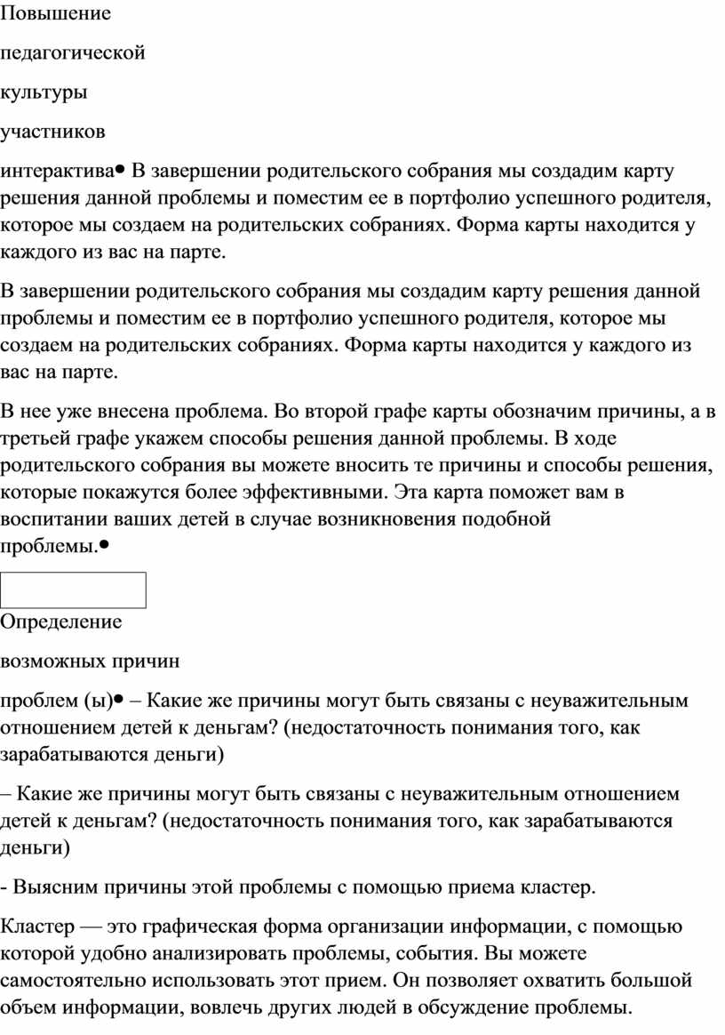 – Давайте возвратимся к первой части нашего родительского собрания. – Какую цель мы поставили на родительском собрании? (узнать, для чего необходимо воспитание разумного отношения к деньгам в семье) – Достигли ли мы цели? –Наша работа, как вы и сказали, позволила достичь поставленную цель: мы вместе разработали карту решения анализируемой проблемы, но вы можете вносить в нее дополнения, так как существует еще другие причины ее возникновения. |