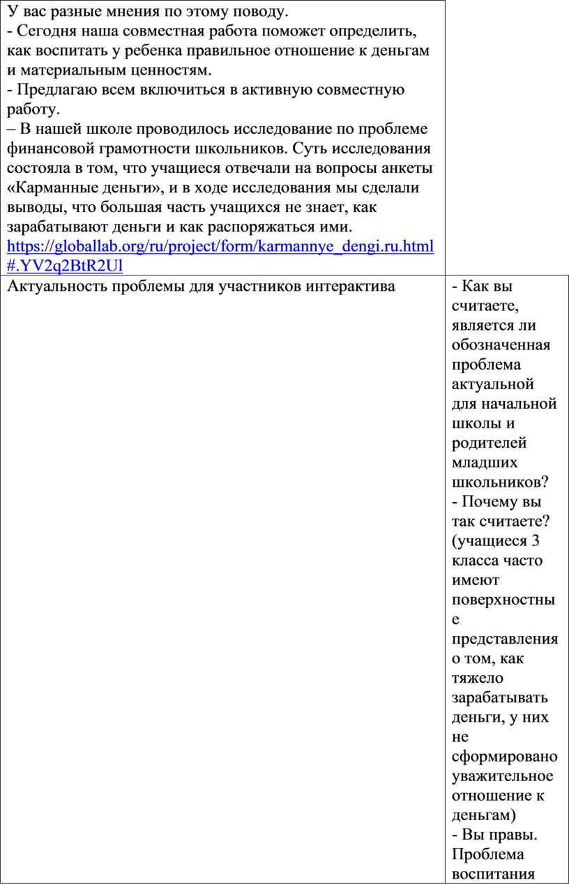 - Сегодня мы рассмотрим одну из актуальных проблем воспитания. Ее суть выявим на основе педагогической ситуации. (Мальчик Миша забегает на перемене в класс и в слезах говорит «Я потерял 100 рублей, которые мне дала мама». А Маша ему отвечает: «Это же всего лишь 100 рублей, хватит реветь!».) - Как вы считаете, какая проблема воспитания детей представлена в данной ситуации? (проблема неуважительного отношения к деньгам в семье) - Я согласна с выявленной проблемой. - Как вы считаете, как лучше поступить учителю, если он слышит такие высказывания детей? У вас разные мнения по этому поводу. - Сегодня наша совместная работа поможет определить, как воспитать у ребенка правильное отношение к деньгам и материальным ценностям. - Предлагаю всем включиться в активную совместную работу. – В нашей школе проводилось исследование по проблеме финансовой грамотности школьников. Суть исследования состояла в том, что учащиеся отвечали на вопросы анкеты «Карманные деньги», и в ходе исследования мы сделали выводы, что большая часть учащихся не знает, как зарабатывают деньги и как распоряжаться ими. https://globallab.org/ru/project/form/karmannye_dengi.ru.html#.YV2q2BtR2Ul |