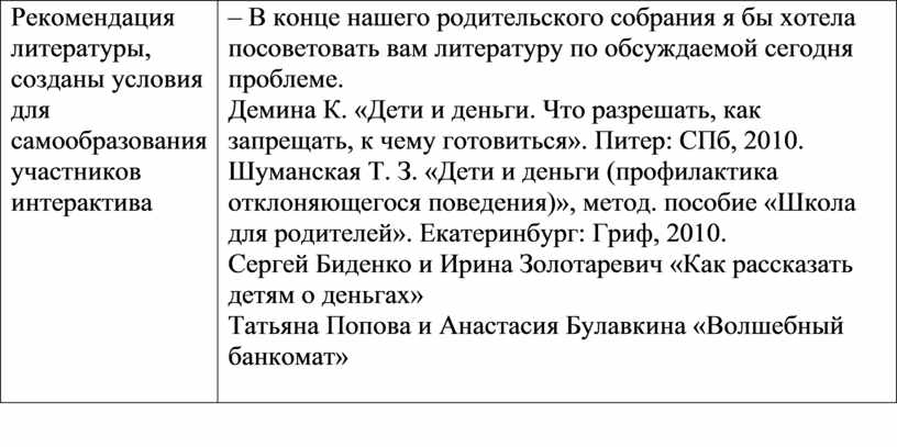 – В конце нашего родительского собрания я бы хотела посоветовать вам литературу по обсуждаемой сегодня проблеме. Демина К. «Дети и деньги. Что разрешать, как запрещать, к чему готовиться». Питер: СПб, 2010. Шуманская Т. З. «Дети и деньги (профилактика отклоняющегося поведения)», метод. пособие «Школа для родителей». Екатеринбург: Гриф, 2010. Сергей Биденко и Ирина Золотаревич «Как рассказать детям о деньгах» Татьяна Попова и Анастасия Булавкина «Волшебный банкомат»