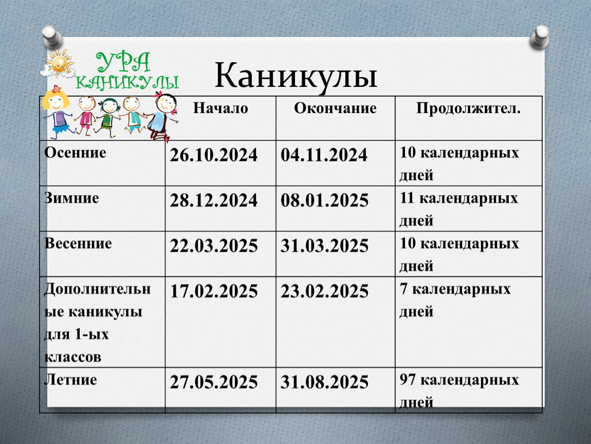 Дополнительные каникулы для 1-ых классов | 17.02.2025 | 23.02.2025 | 7 календарных дней |