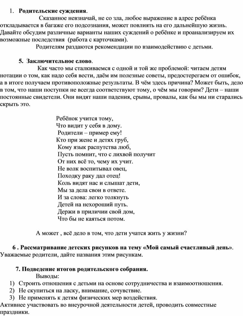 7. Подведение итогов родительского собрания.