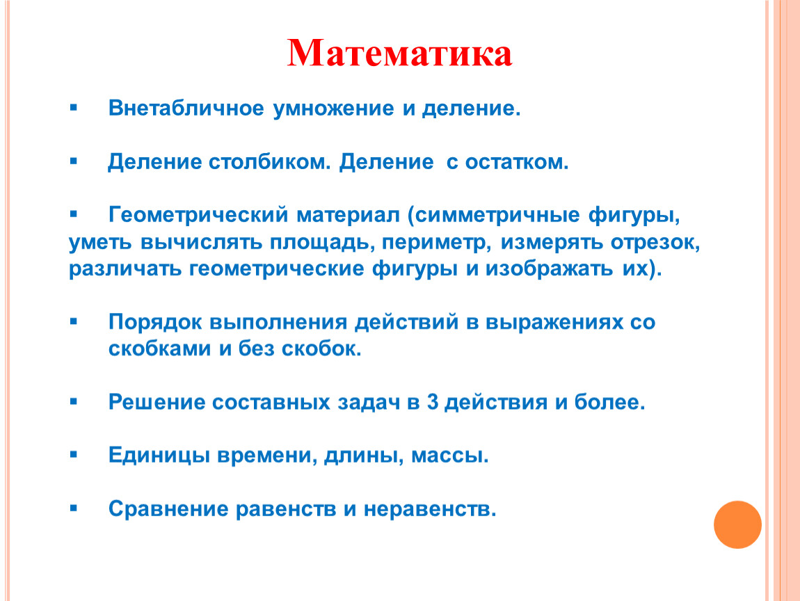 Геометрический материал (симметричные фигуры, уметь вычислять площадь, периметр, измерять отрезок, различать геометрические фигуры и изображать их).