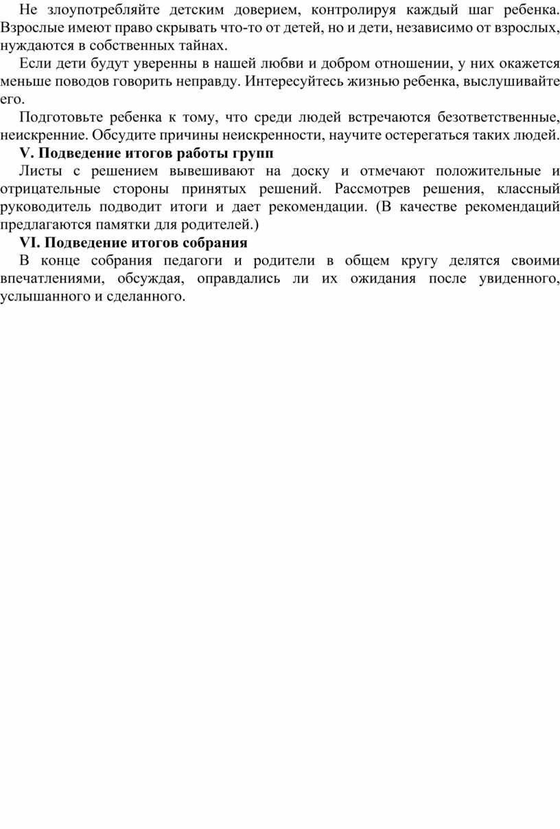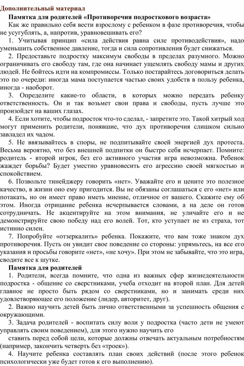 Листы с решением вывешивают на доску и отмечают положительные и отрицательные стороны принятых решений. Рассмотрев решения, классный руководитель подводит итоги и дает рекомендации. (В качестве рекомендаций предлагаются памятки для родителей.)
