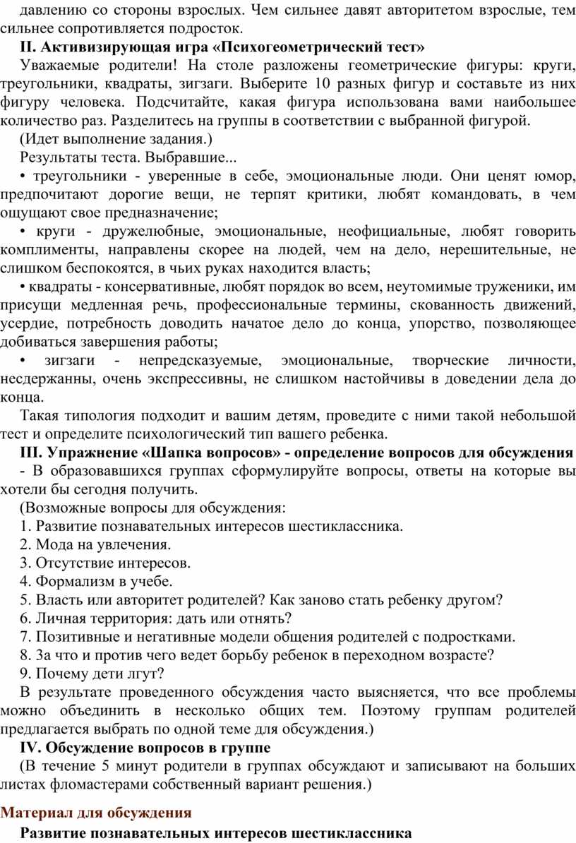Оформление помещения, оборудование и инвентарь: набор геометрических фигур для «Психогеометрического теста» (вырезать из картона достаточное количество кругов, квадратов, треугольников, зигзагов); цитаты на доске: