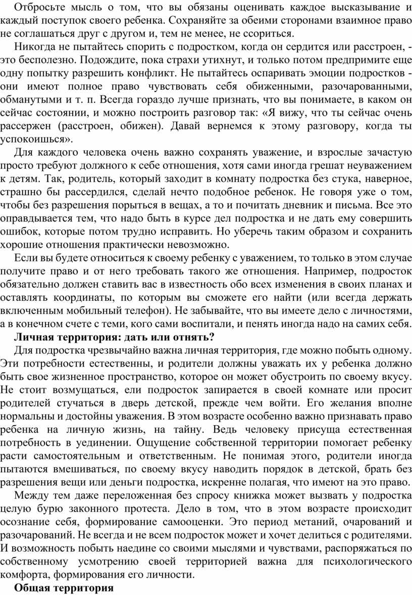 Для подростка чрезвычайно важна личная территория, где можно побыть одному. Эти потребности естественны, и родители должны уважать их у ребенка должно быть свое жизненное пространство, которое он может обустроить по своему вкусу. Не стоит возмущаться, ели подросток запирается в своей комнате или просит родителей стучаться в дверь детской, прежде чем войти. Его желания вполне нормальны и достойны уважения. В этом возрасте особенно важно признавать право ребенка на личную жизнь, на тайну. Ведь человеку присуща естественная потребность в уединении. Ощущение собственной территории помогает ребенку расти самостоятельным и ответственным. Не понимая этого, родители иногда пытаются вмешиваться, по своему вкусу наводить порядок в детской, брать без разрешения вещи или деньги подростка, искренне полагая, что имеют на это право.