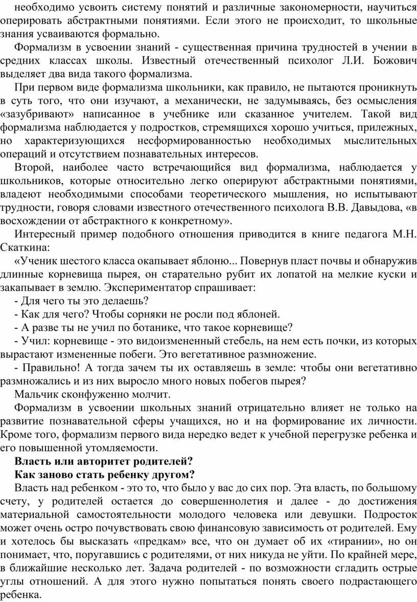 Формализм в усвоении знаний - существенная причина трудностей в учении в средних классах школы. Известный отечественный психолог Л.И. Божович выделяет два вида такого формализма.