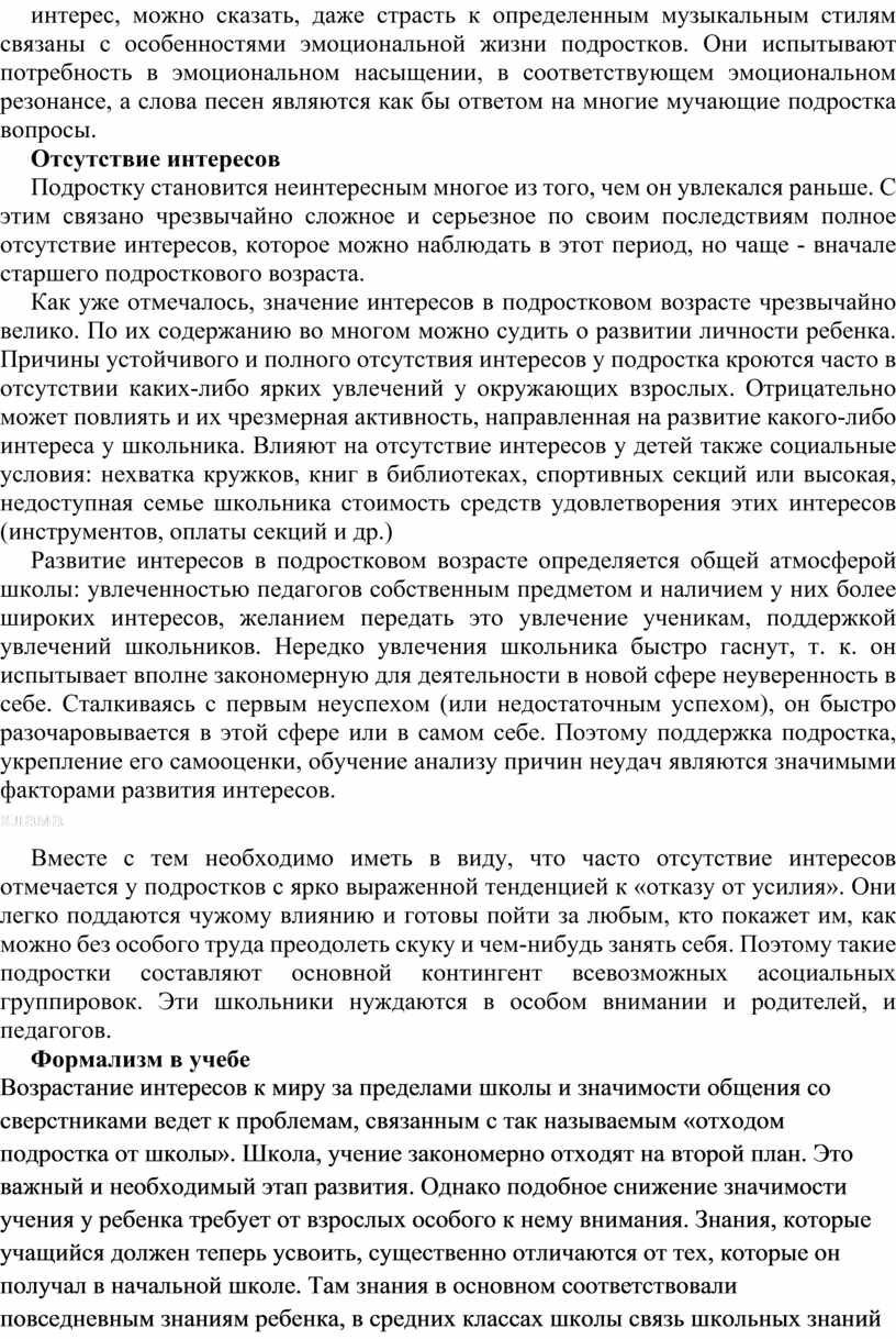 Как уже отмечалось, значение интересов в подростковом возрасте чрезвычайно велико. По их содержанию во многом можно судить о развитии личности ребенка. Причины устойчивого и полного отсутствия интересов у подростка кроются часто в отсутствии каких-либо ярких увлечений у окружающих взрослых. Отрицательно может повлиять и их чрезмерная активность, направленная на развитие какого-либо интереса у школьника. Влияют на отсутствие интересов у детей также социальные условия: нехватка кружков, книг в библиотеках, спортивных секций или высокая, недоступная семье школьника стоимость средств удовлетворения этих интересов (инструментов, оплаты секций и др.)