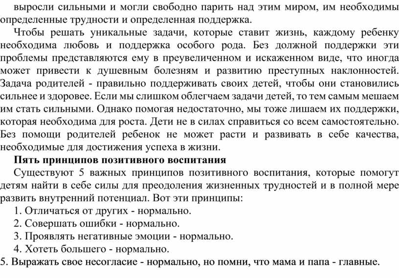 Существуют 5 важных принципов позитивного воспитания, которые помогут детям найти в себе силы для преодоления жизненных трудностей и в полной мере развить внутренний потенциал. Вот эти принципы: