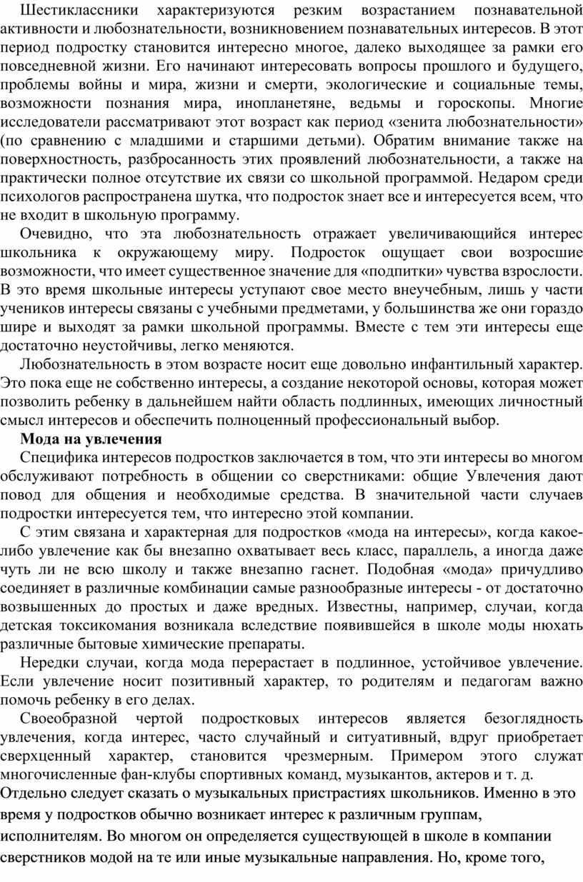 Шестиклассники характеризуются резким возрастанием познавательной активности и любознательности, возникновением познавательных интересов. В этот период подростку становится интересно многое, далеко выходящее за рамки его повседневной жизни. Его начинают интересовать вопросы прошлого и будущего, проблемы войны и мира, жизни и смерти, экологические и социальные темы, возможности познания мира, инопланетяне, ведьмы и гороскопы. Многие исследователи рассматривают этот возраст как период «зенита любознательности» (по сравнению с младшими и старшими детьми). Обратим внимание также на поверхностность, разбросанность этих проявлений любознательности, а также на практически полное отсутствие их связи со школьной программой. Недаром среди психологов распространена шутка, что подросток знает все и интересуется всем, что не входит в школьную программу.