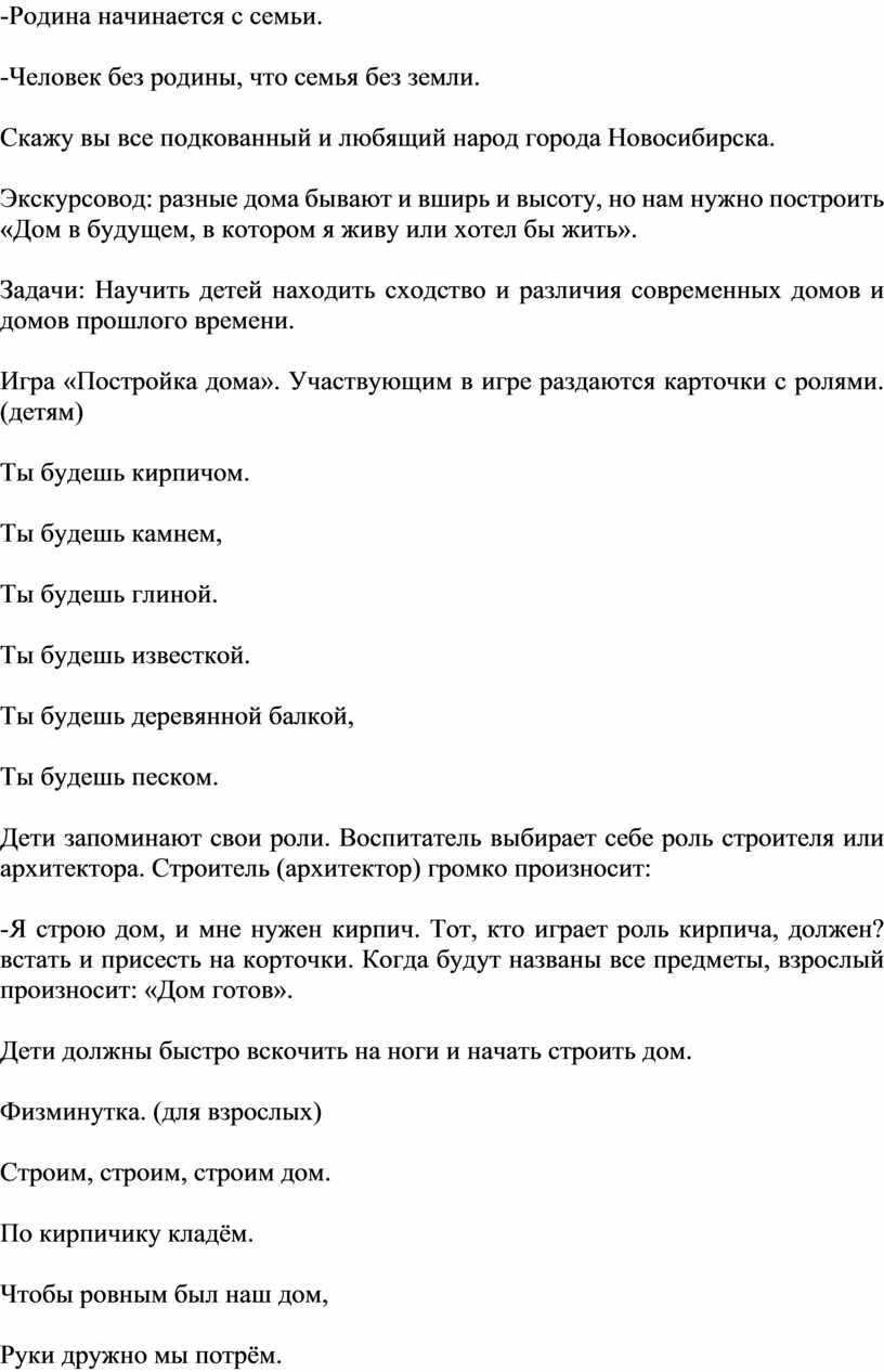 -Я строю дом, и мне нужен кирпич. Тот, кто играет роль кирпича, должен? встать и присесть на корточки. Когда будут названы все предметы, взрослый произносит: «Дом готов».