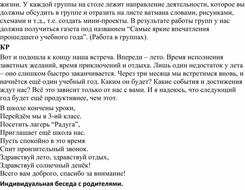 Вот и подошла к концу наша встреча. Впереди – лето. Время исполнения заветных желаний, время приключений и отдыха. Лишь один недостаток у лета – оно слишком быстро заканчивается. Через три месяца мы встретимся вновь, и начнётся ещё один учебный год. Каким он будет? Какие события и достижения ждут нас? Всё это зависит только от нас с вами. И я надеюсь, что следующий год будет ещё продуктивнее, чем этот.