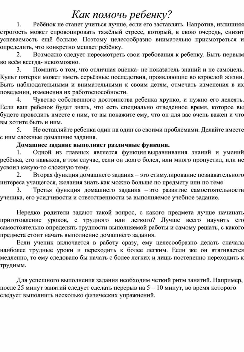 иметь серьёзные последствия, проявляющие во взрослой жизни. 4. Чувство собственного достоинства ребенка хрупко, и нужно его лелеять. Если ваш ребенок будет знать, что есть специально отведенное время, которое вы будете проводить вместе с ним, то вы покажите ему, что он для вас очень важен и что вы хотите быть и ним. 5. Не оставляйте ребенка один на один со своими проблемами. Делайте вместе с ним сложные домашние задания. Домашнее задание выполняет различные функции. 1. Одной из главных является функция выравнивания знаний и умений ребёнка, его навыков, в том случае, если он долго болел, или много пропустил, или не усвоил какую-то сложную тему. 2. Вторая функция домашнего задания – это стимулирование познавательного интереса учащегося, желания знать как можно больше по предмету или по теме. 3. Третья функция домашнего задания – это развитие самостоятельности ученика, его усидчивости и ответственности за выполняемое учебное задание.